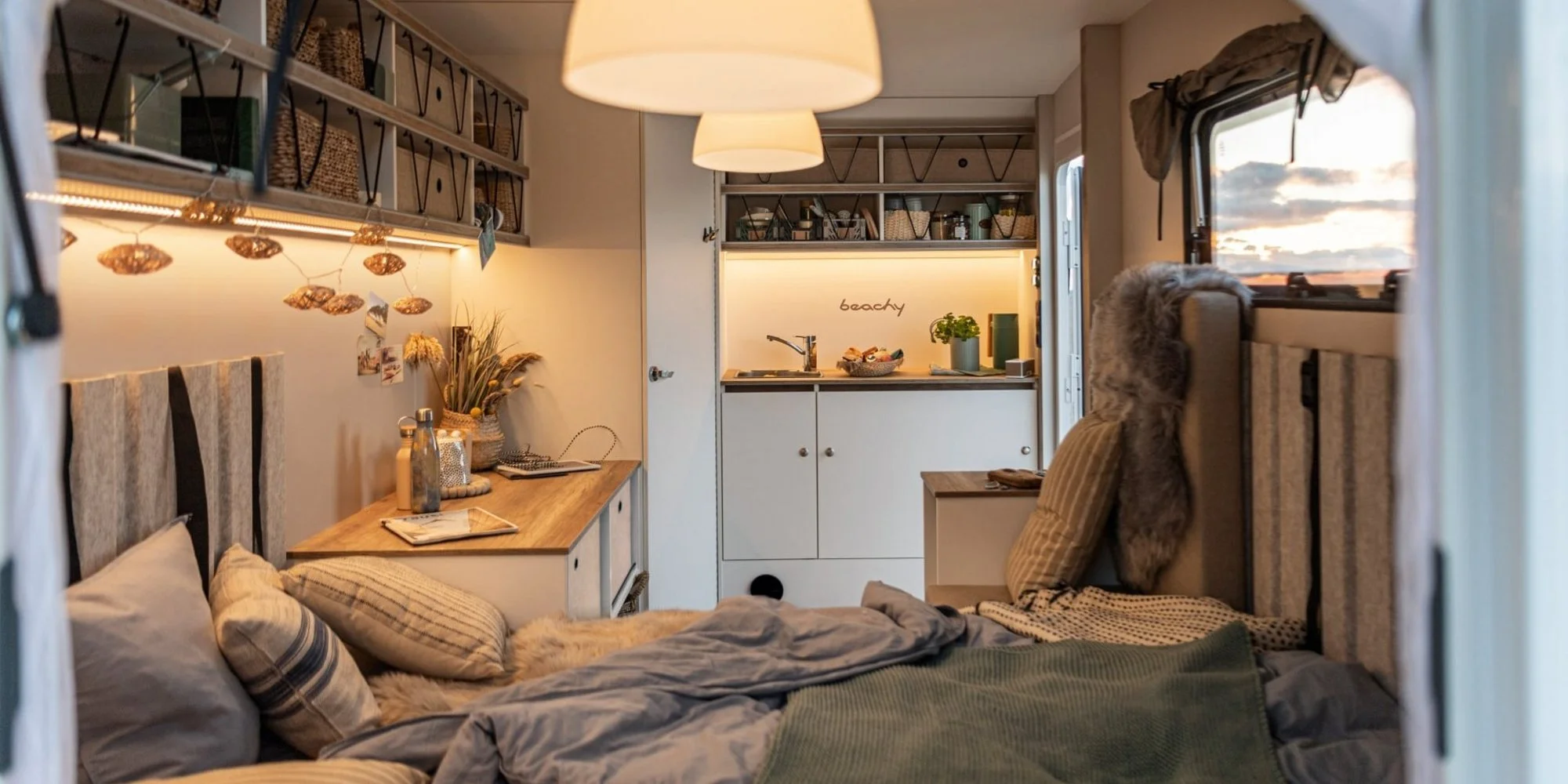 Avec son ambiance "bord de mer", la Hobby Beachy 450 crée une atmosphère chaleureuse et relaxante. Des matériaux naturels et des tissus inspirés du style Beachhouse apportent une sensation d'évasion à l’intérieur. De plus, la porte arrière extralarge permet d’ouvrir l’espace intérieur sur l’extérieur, parfait pour un repas en plein air avec une vue imprenable.