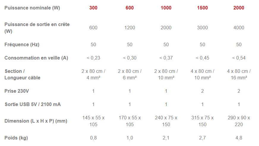 - Polyvalence : Transforme le courant 12V en 230V, idéal pour alimenter vos appareils domestiques en mobilité.